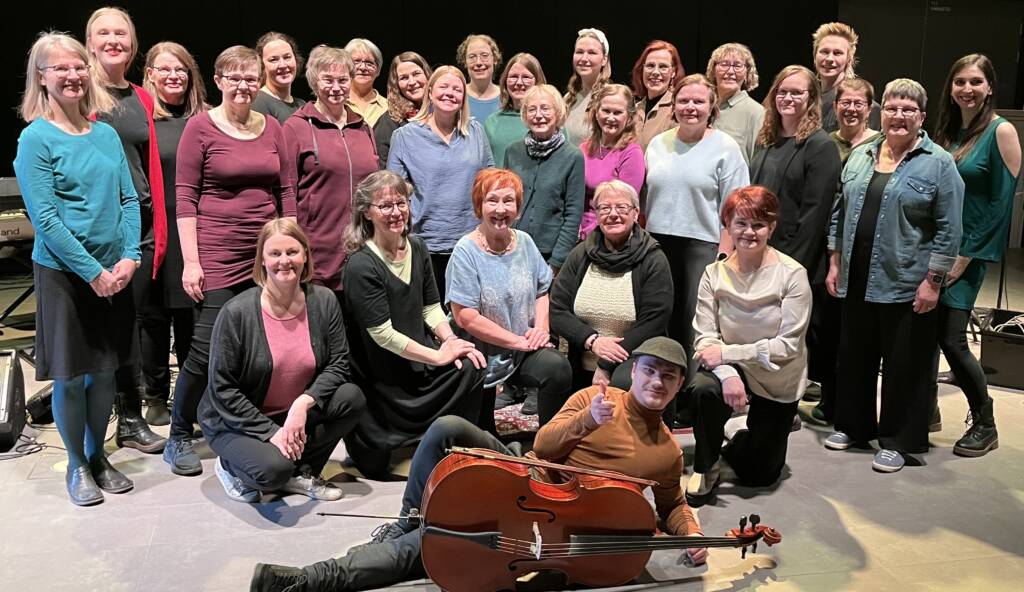 Valkeakoski-opiston Pop & Jazz -lauluryhmä ja lauluryhmä Soiva Kangasalta laulavat yhdessä kaunista ja menevää musiikkia, sellistinä Jaakko Kuusisto.